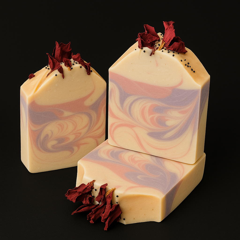 Each bar is a visual treat—swirled in soft, elegant hues and topped with dried rose petals and a sprinkle of poppy seeds for a naturally luxurious finish.